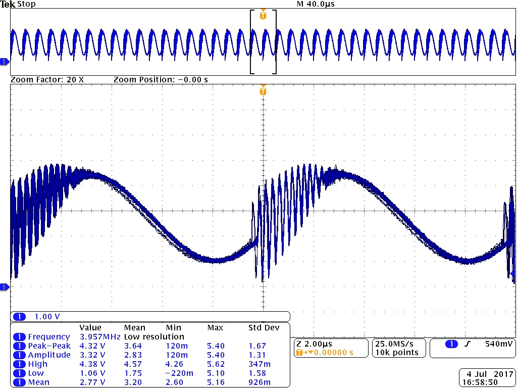 次に、容量値2nFの結果が得られた時の波形を観測してみます。下図左の波形は、正常な容量値が得られた時の波形と比較すると、100KHzのSin波以外に寄生振動の様な波形が重畳されています。更に、寄生振動部分を拡大した結果が下図右の波形で、4.3MHzの周波数成分を持ち徐々に振幅が低下していく様子が伺えます。