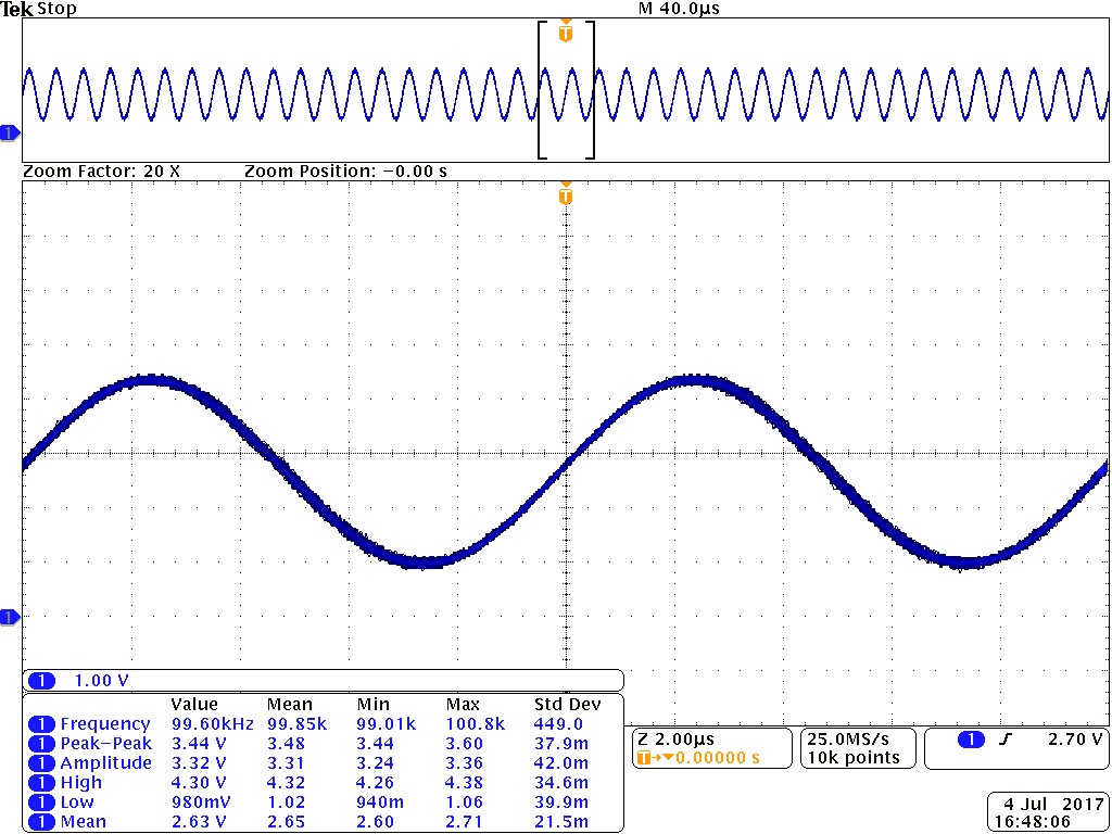 LCRメーターはDUTに交流信号を印加し、交流電圧と交流電流の比率からインピーダンス(以下、Zと記す。)を算出します。更に、交流電圧と交流電流の位相差も測定し、Zを抵抗(以下、Rと記す。)、容量(以下、Cと記す。)、インダクタンス(以下、Lと記す。)に分解し測定結果が表示されます。では、容量測定時にどの様な交流電圧がDUTに印加されているか観測してみます。 下図は、容量測定時にオシロスコープで観測したDUTに印加された波形で、100KHzのSin波である事が分かります。この時の容量値測定結果は、40pF位で概ね想定通りの結果が得られました。