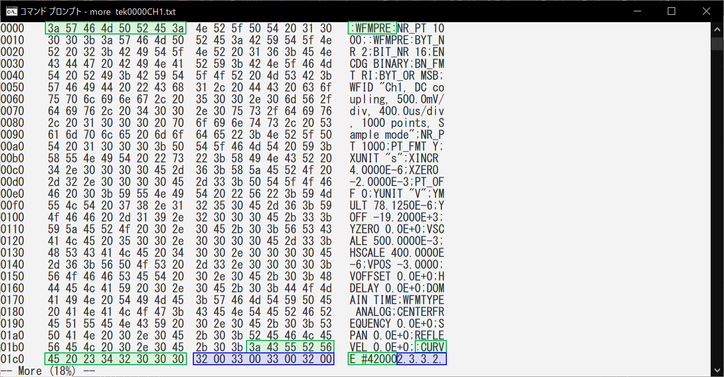 Binary波形Fileを16進数に変換したtek0000CH1.txtの中身をmoreで見てみます。一番左上の0000から始まる数字は、アドレスでその右側にアドレス0000から000fに格納された[8 bytes] [Space] [8 bytes]のデータが16進数で表示されています。更にその右側に、データをASCII表示した場合の文字が表示されています。アドレス0000から0007は、”3a 57 46 4d 50 52 45 3a”なのでASCII表示すると”:WFMPRE:”になります。アドレス0000から01baまでは、Preambleが格納されアドレス01bbからBinary波形データが格納されています。